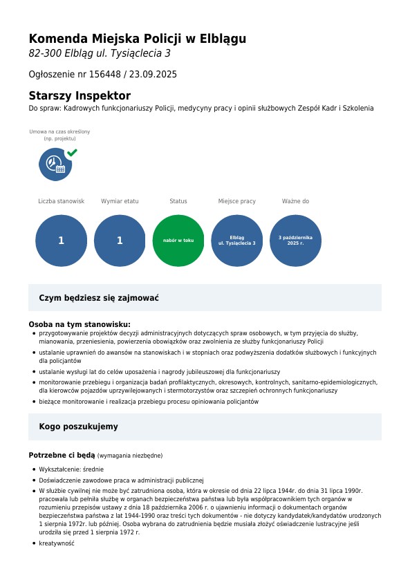 Starszy Inspektor do spraw: Kadrowych funkcjonariuszy Policji, medycyny pracy i opinii służbowych Zespół Kadr i Szkolenia str.1 str.2 str.3 str.4 Pliki do pobrania starszy-inspektor,156448 Data publikacji 23.09.2025 08:00 (pdf 67.13 KB)