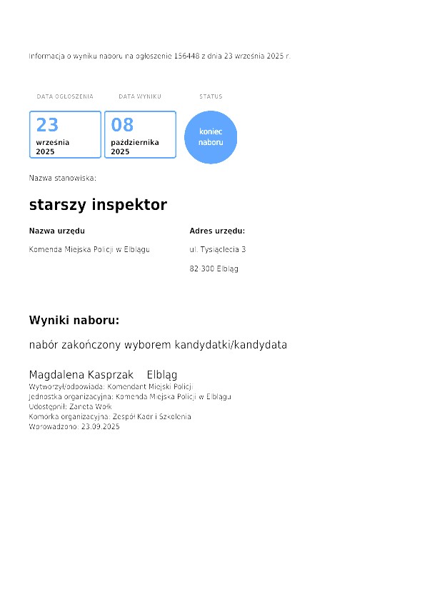 Wyniki naboru - Starszy Inspektor do spraw: Kadrowych funkcjonariuszy Policji, medycyny pracy i opinii służbowych Zespół Kadr i Szkolenia Pliki do pobrania 156448 wynik naboru Data publikacji 13.10.2025 12:00 (pdf 31.56 KB)